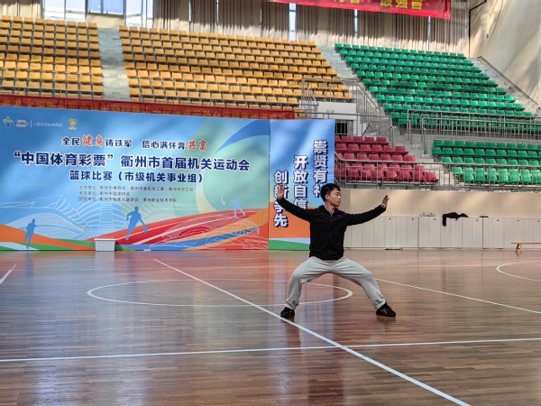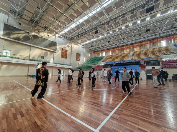 比赛结束后,全体老师跟着张光虎老师学习二十四式太极拳中的“野马分鬃”“白鹤亮翅”动作。