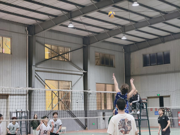 男排赛场上,队员们身形矫健、配合默契。大力发球似炮弹呼啸,精准扣杀如闪电划破长空,顽强防守像壁垒坚不可摧。队员们面对困境毫不退缩,每球必争,展现出衢职运动健儿的精气神。